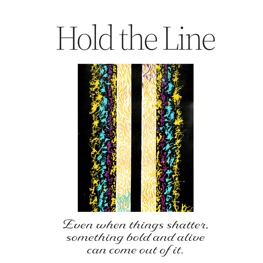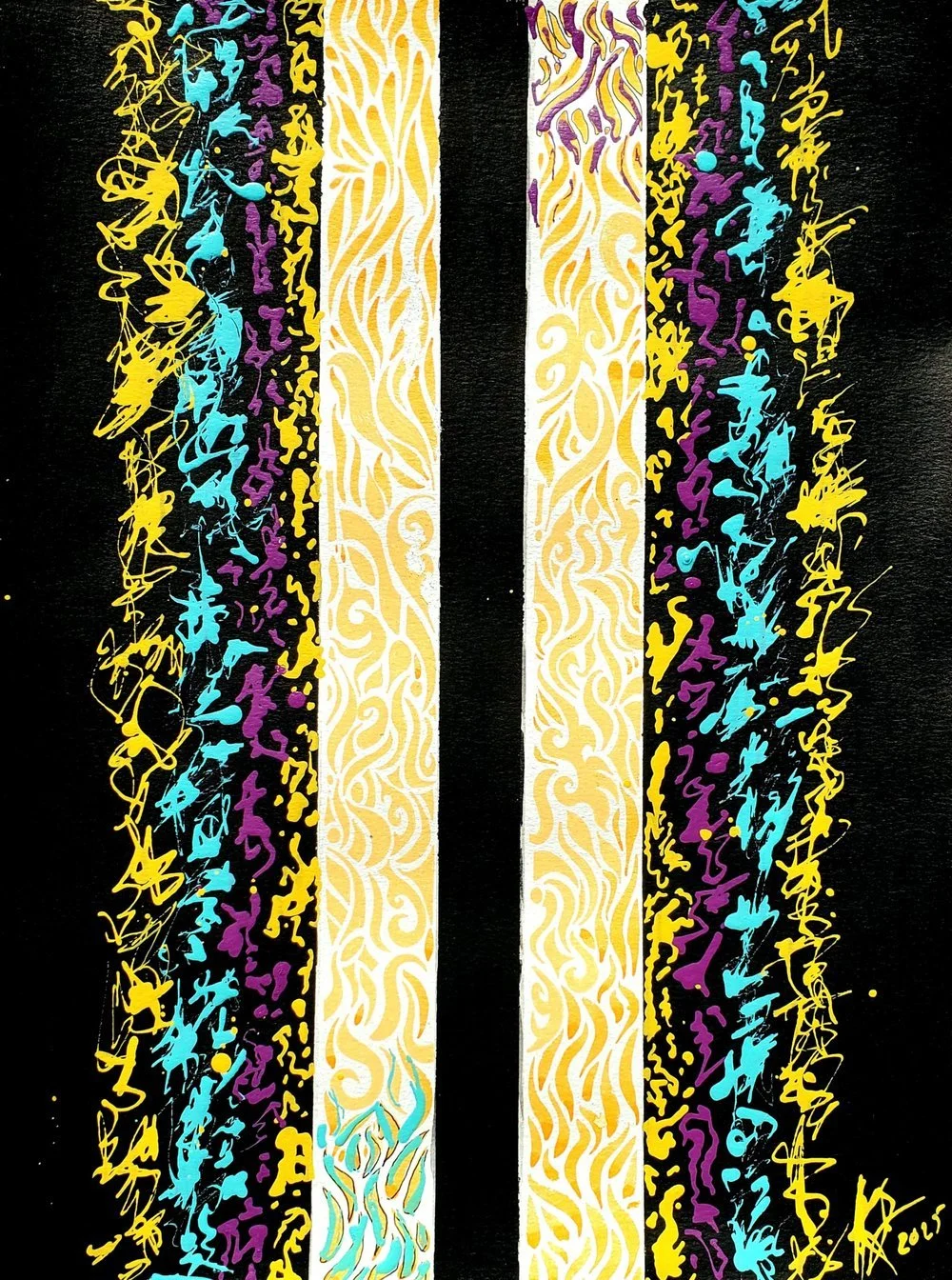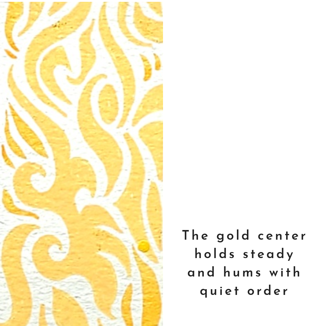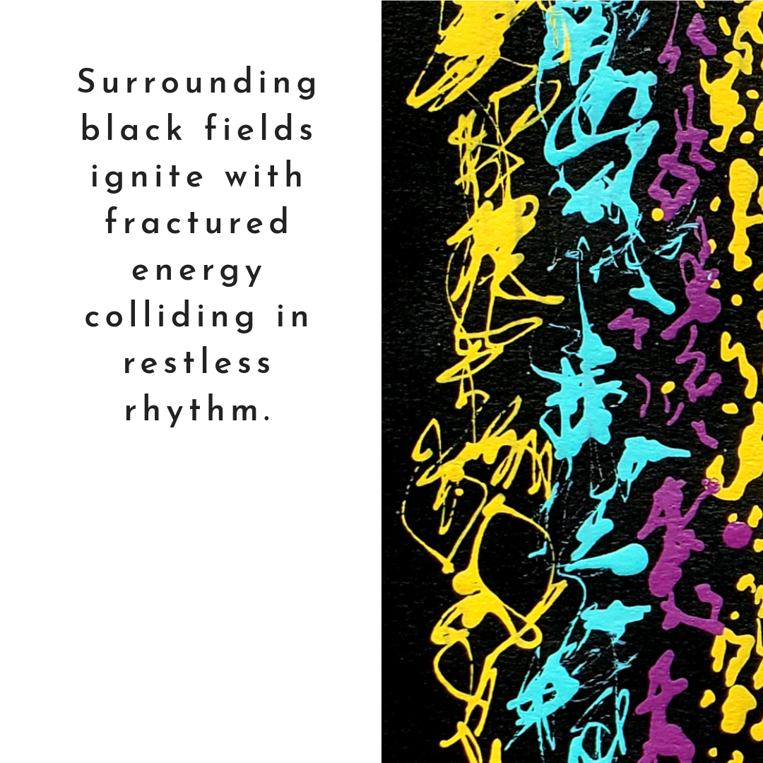 This piece started with the idea of double yellow lines on a road, don’t cross. Life has a way of testing limits and pushing past boundaries though, and here the line has definitely been crossed. The gold center holds steady and hums with quiet order, while the surrounding black fields ignite with fractured energy colliding in restless rhythm. It’s about tension, breaking points, and how even when things shatter, something bold and alive can come out of it.